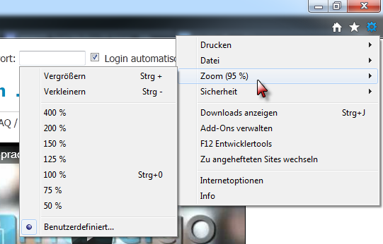 Im Internet Explorer finden Sie diese Einstellung unter: Extras -> Zoom